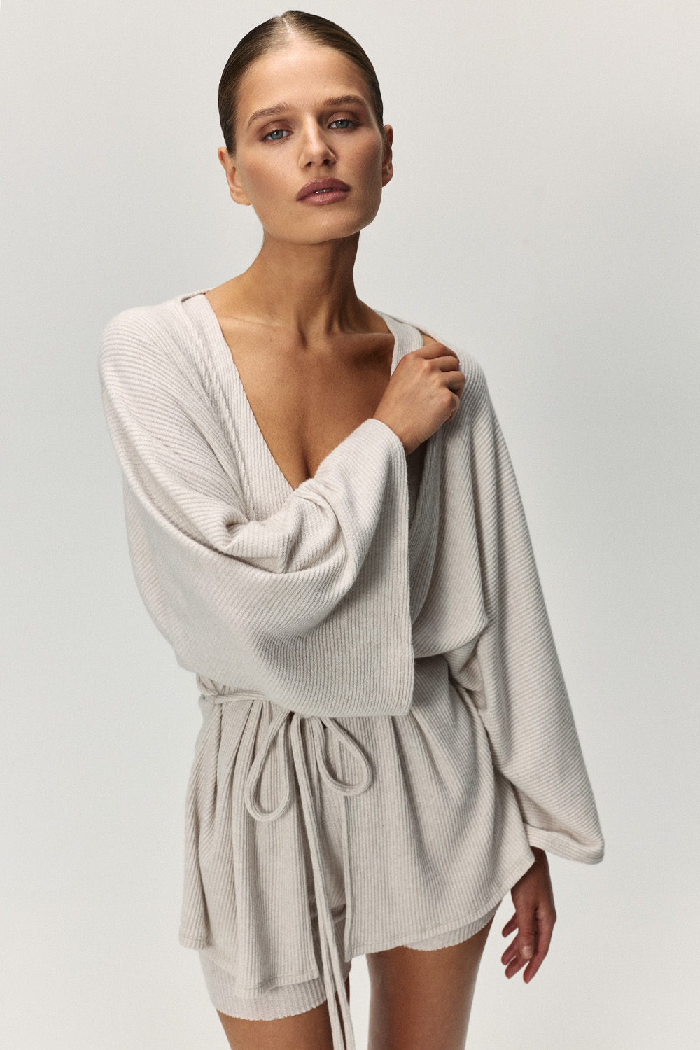 Кимоно с поясом. Фактура данной модели имеет крупную вязку, поэтому при стирке возможна небольшая усадка изделия.
