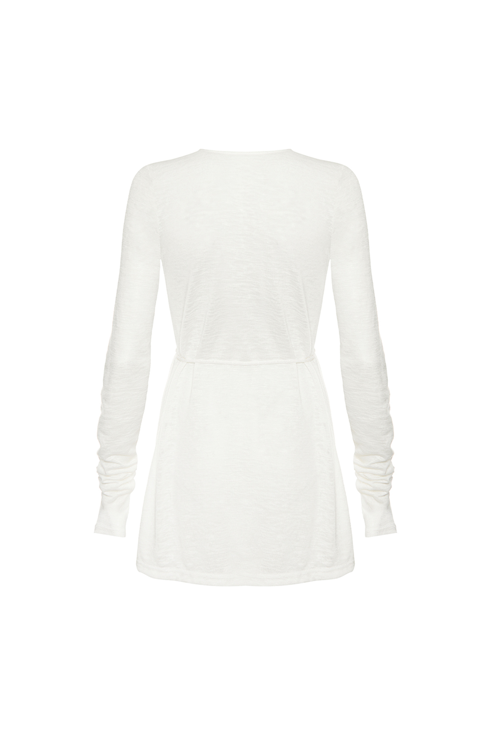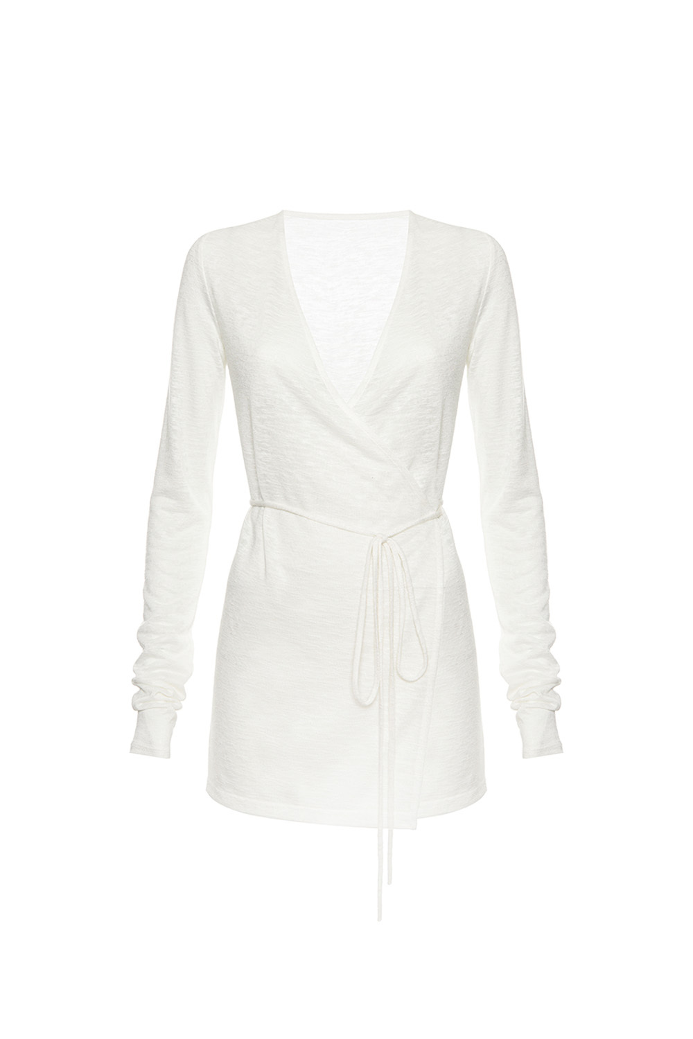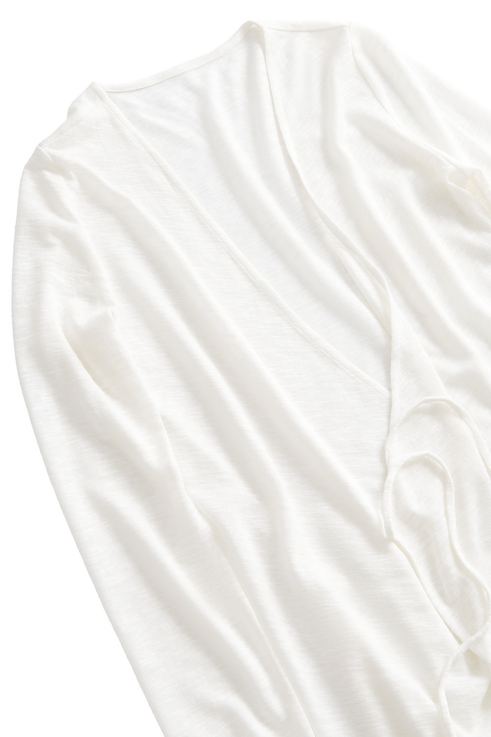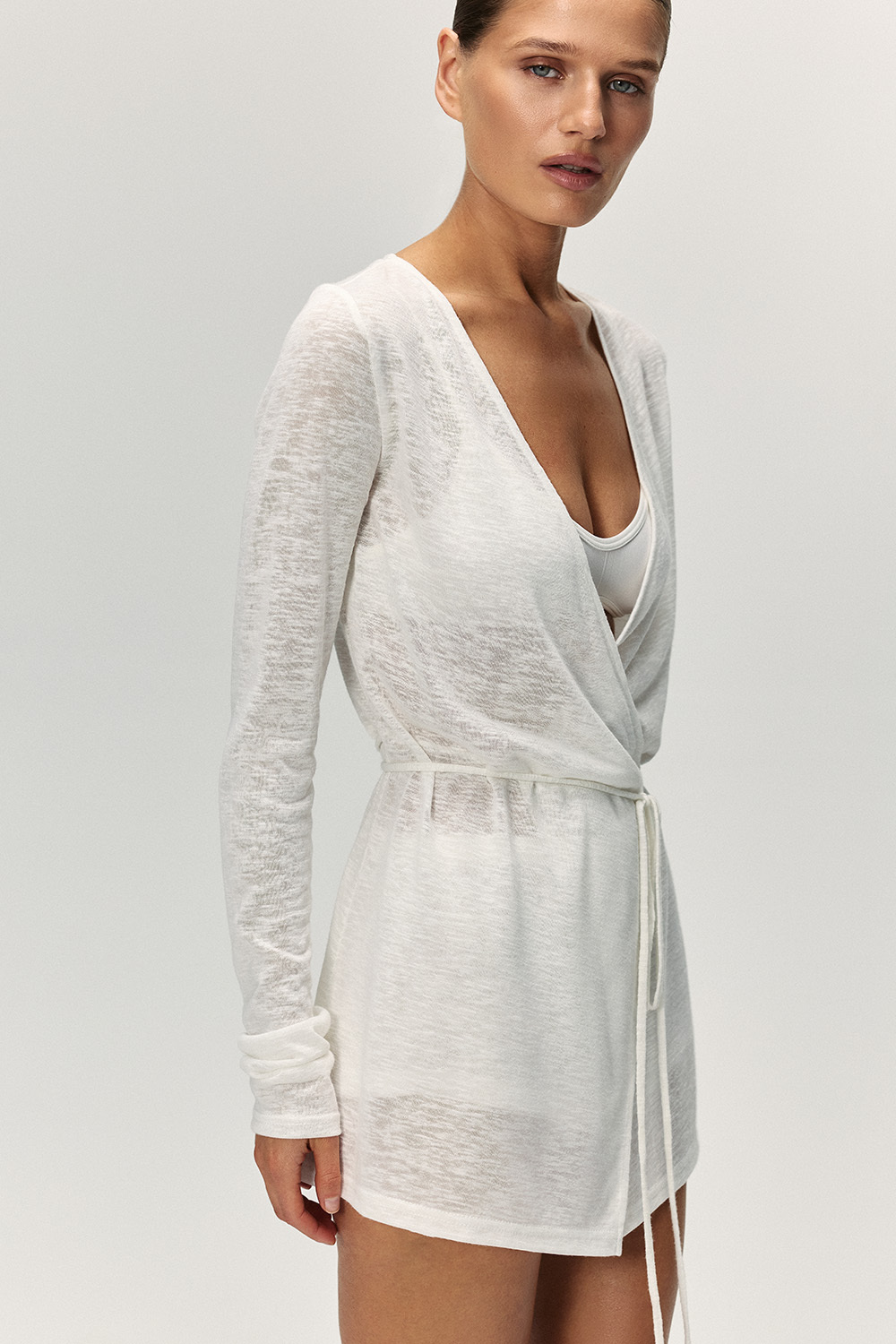 Удлинённое кимоно с поясом из полупрозрачной ткани.