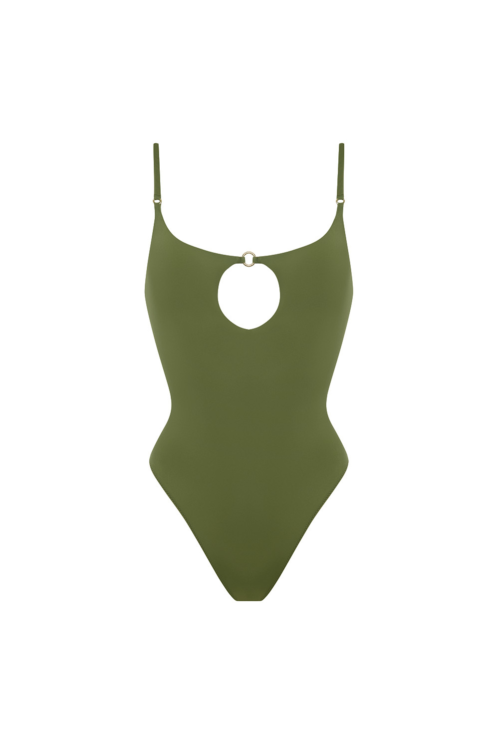 Слитный купальник с декоративным вырезом. Модель на тонких регулируемых бретелях, не имеет съёмных чаш.