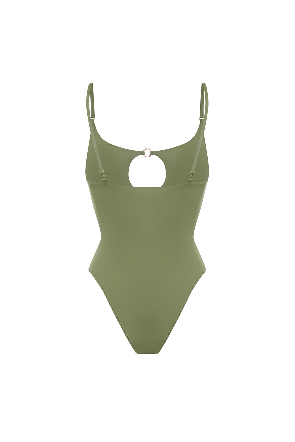 Слитный купальник с декоративным вырезом. Модель на тонких регулируемых бретелях, не имеет съёмных чаш.