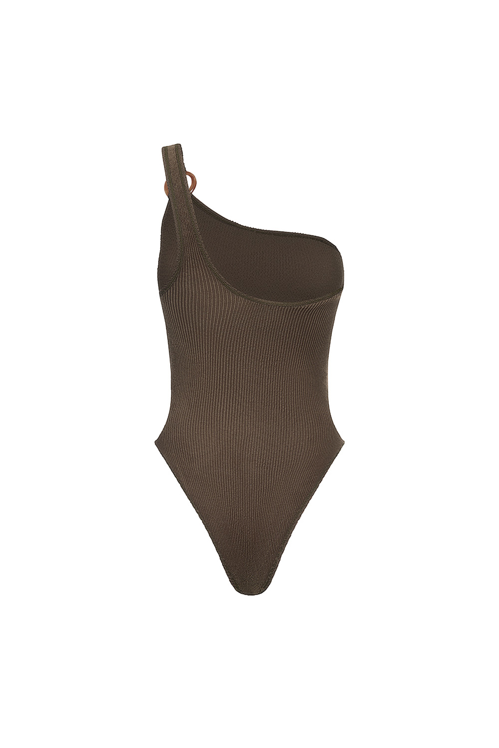 Бесшовный слитный купальник на одно плечо с фурнитурой в виде кольца.