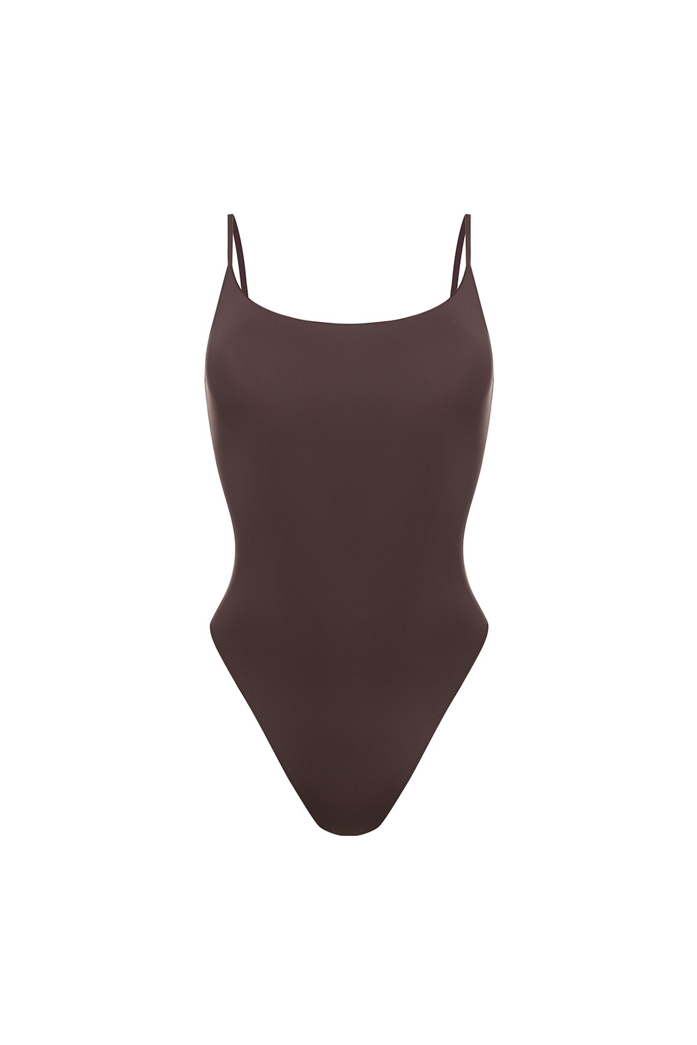 Слитный купальник с глубоким вырезом на груди и высокой линией ног на регулируемых бретелях. Не имеет съёмных чаш.