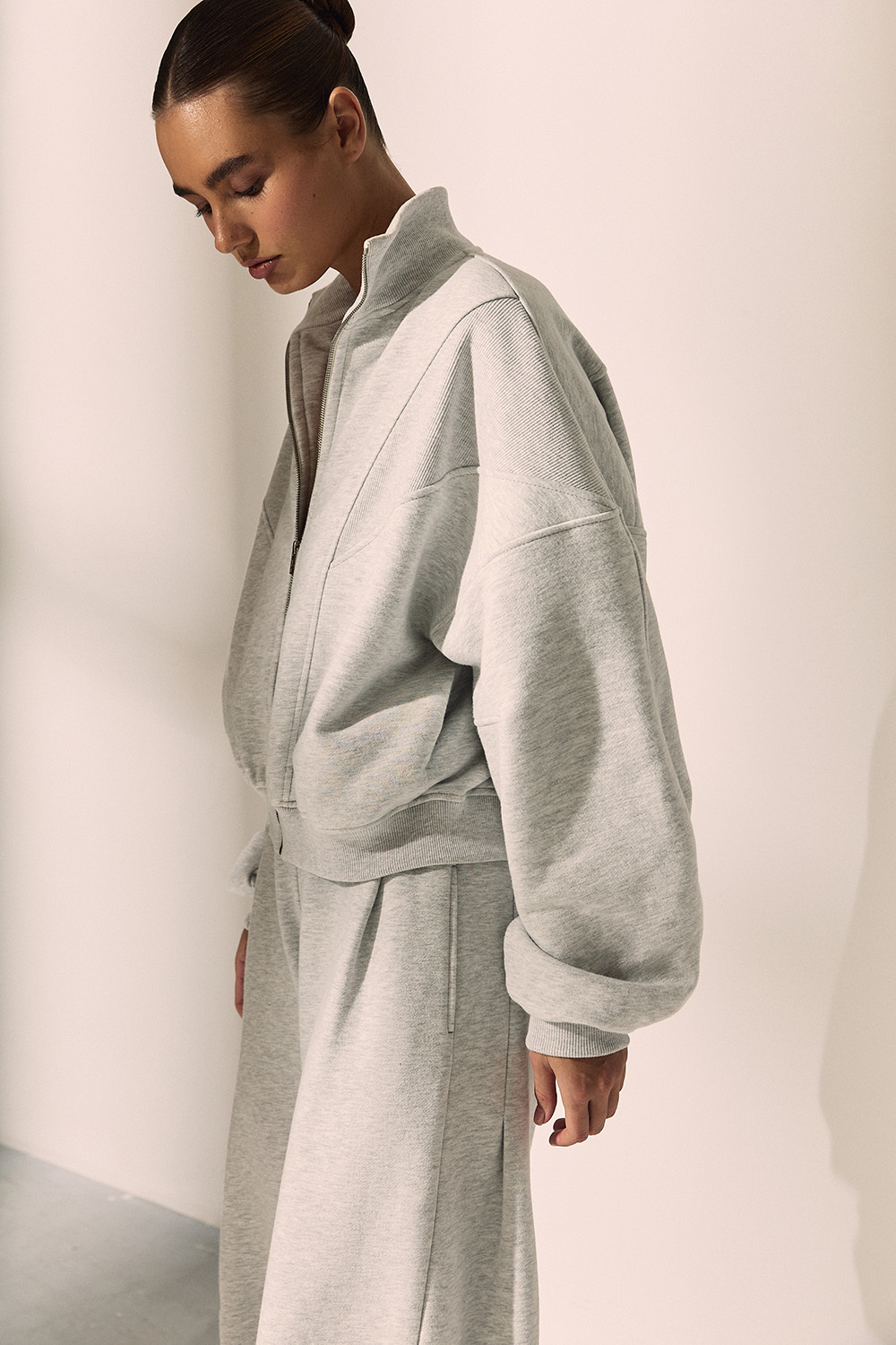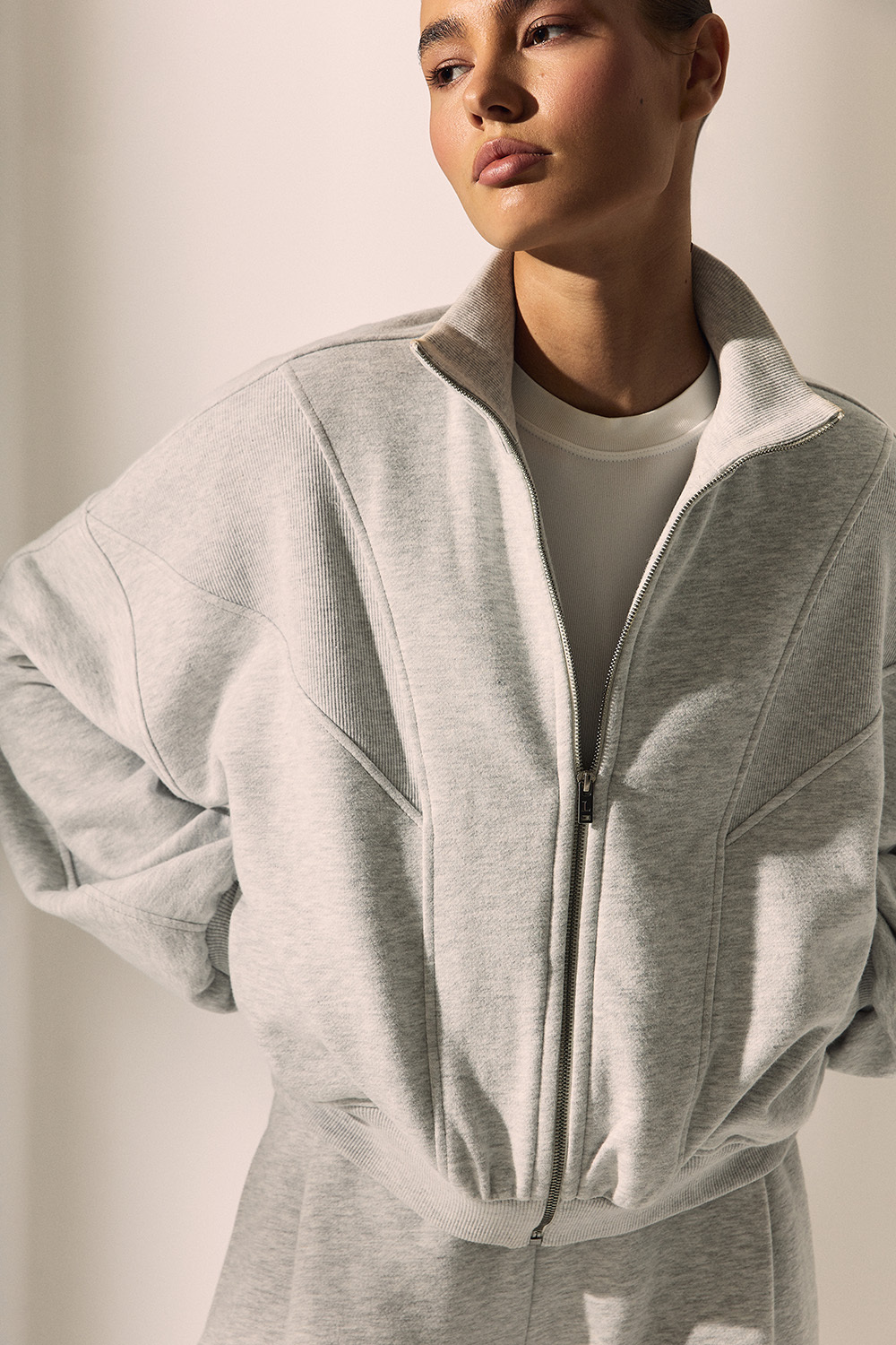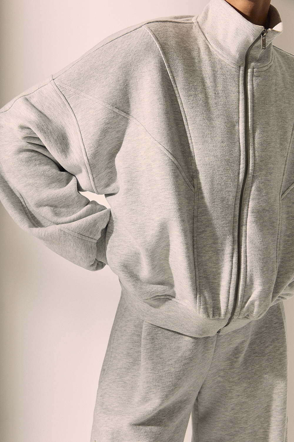 Олимпийка из утеплённого футера на молнии с рельефными швами. Модель с двумя прорезными карманами и рукавом реглан.