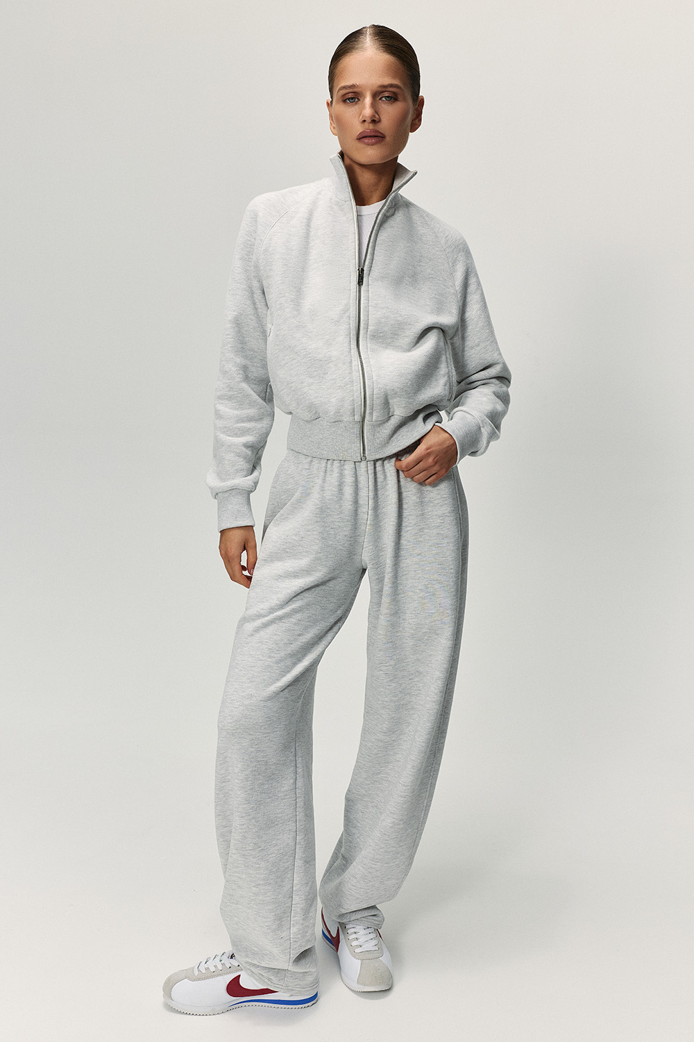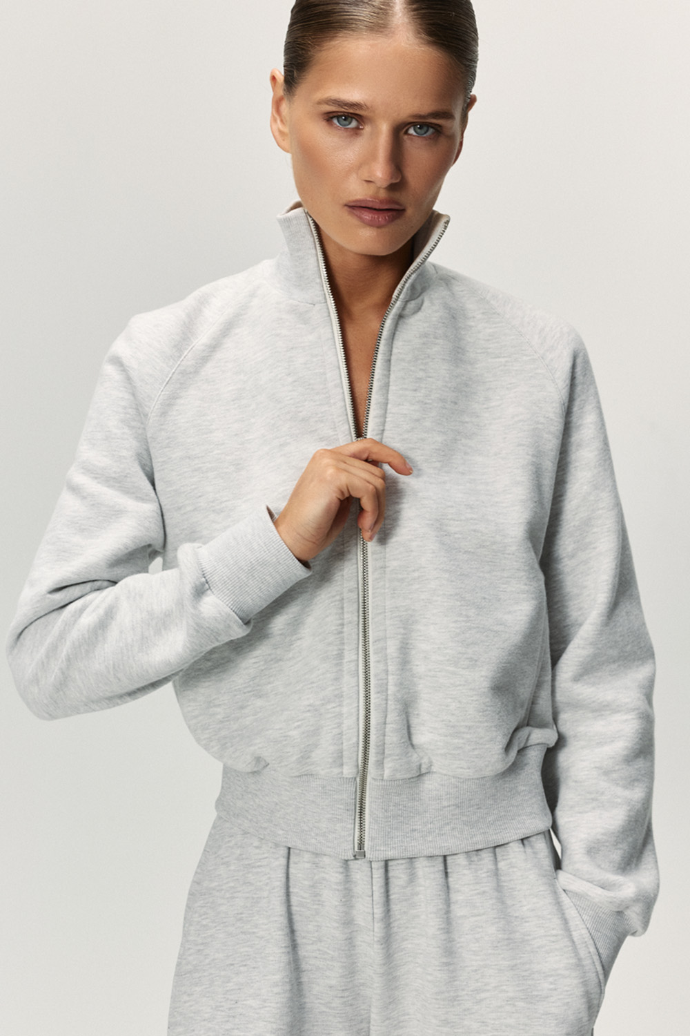 Олимпийка из утеплённого футера. Модель с карманами на молнии и рукавом реглан.