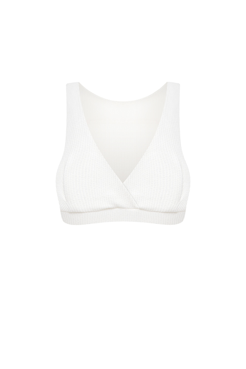 Топ с глубоким V-образным вырезом. Не имеет чаш. Фактура данной модели имеет крупную вязку, поэтому при стирке возможна небольшая усадка изделия.