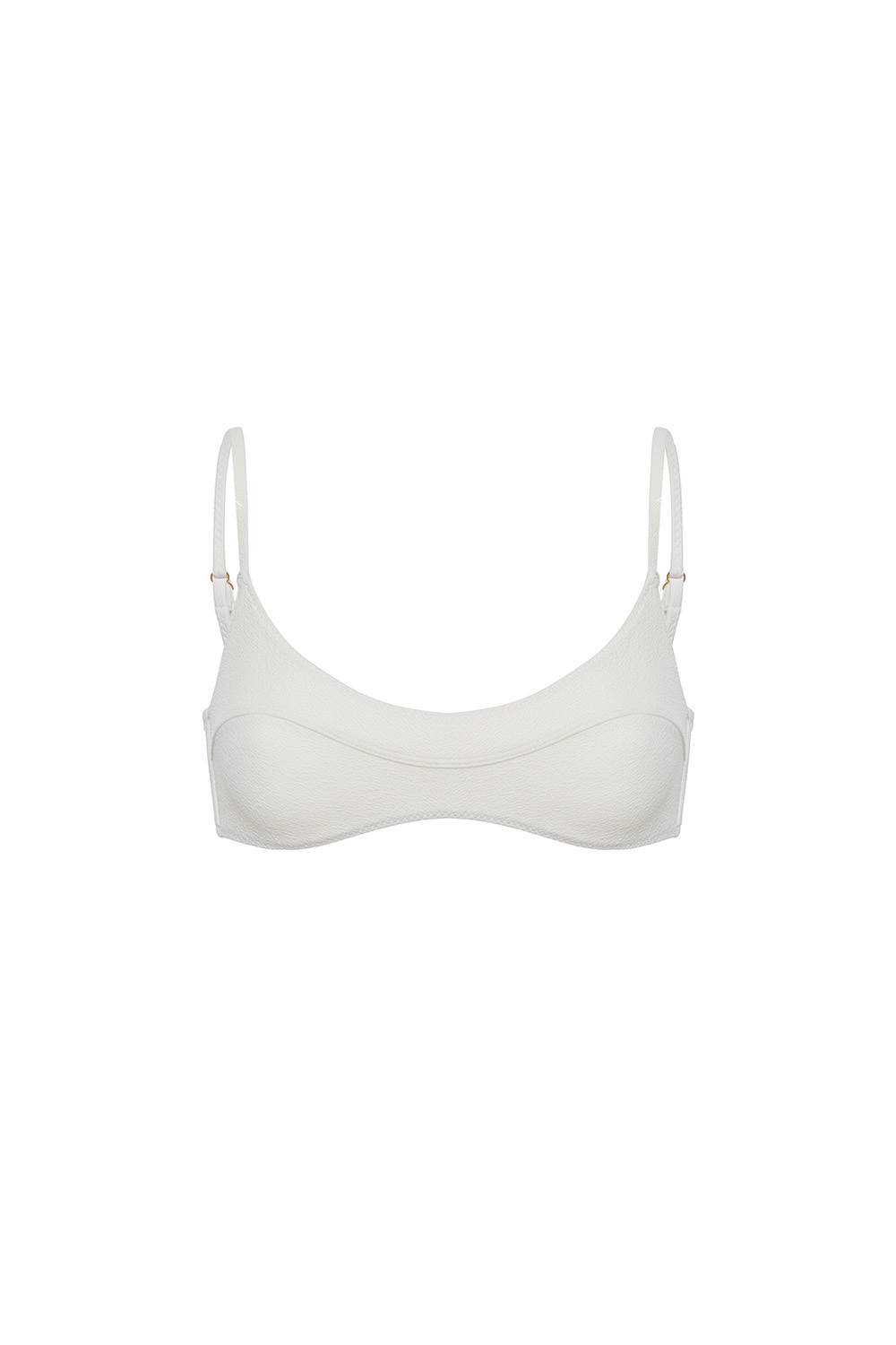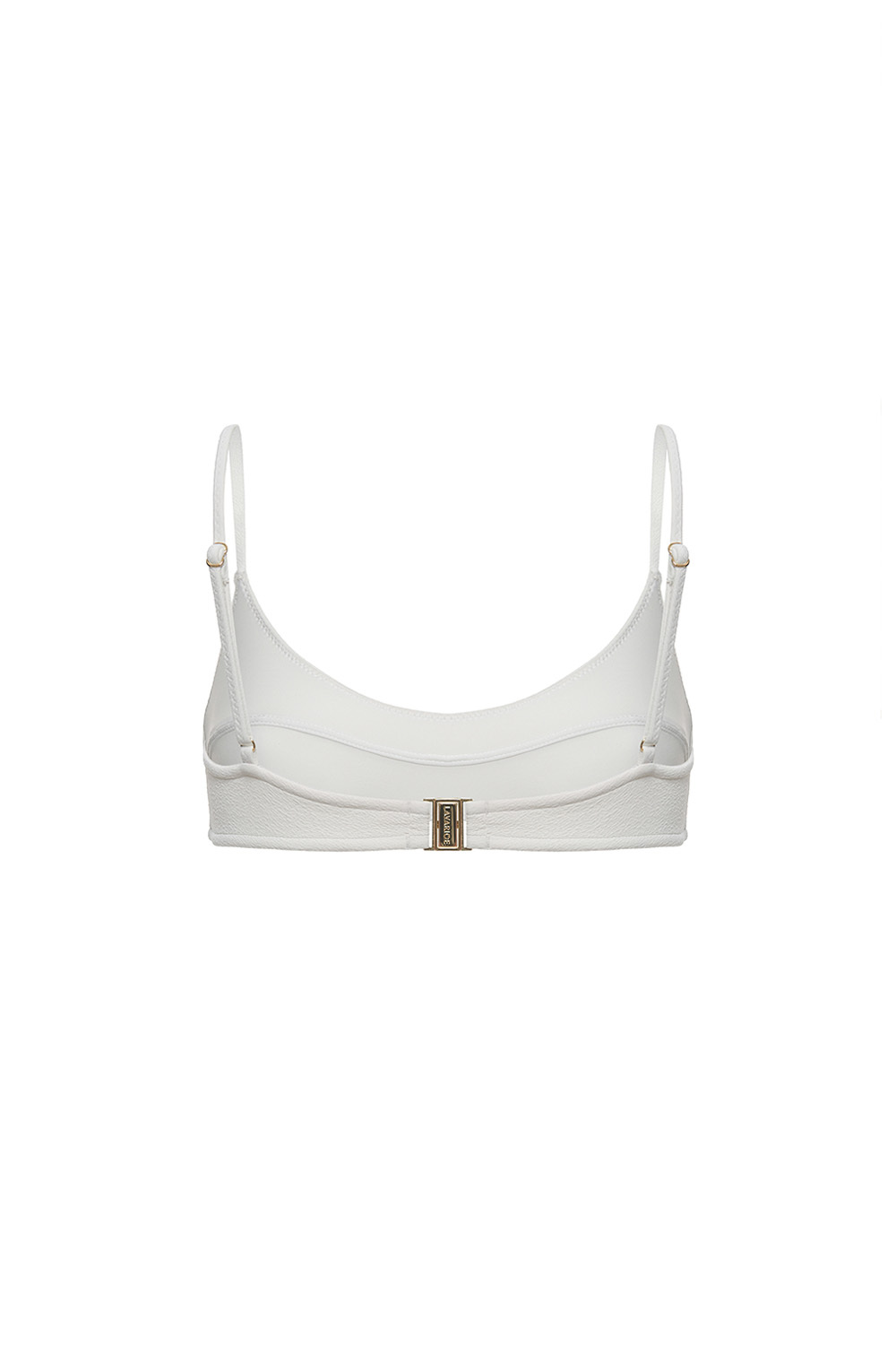 Верх купальника на регулируемых бретелях с металлической застежкой сзади. Не имеет съёмных чаш.